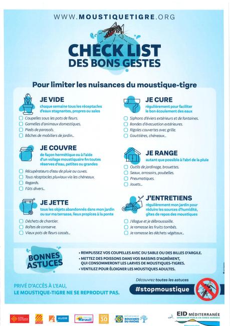 Parce que le moustique vit près de nos habitations, la lutte contre sa prolifération est l'affaire de tout un chacun. Pour éviter qu’il ne se reproduise et ne prolifère, il faut détruire ses œufs et donc supprimer les eaux dans lesquelles la femelle pond.